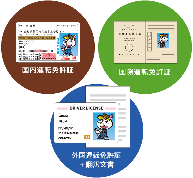 「外国運転免許証」「日本語翻訳文」「運転者のパスポート」を合わせて、ご持参ください。 - 日本語による翻訳文の発行